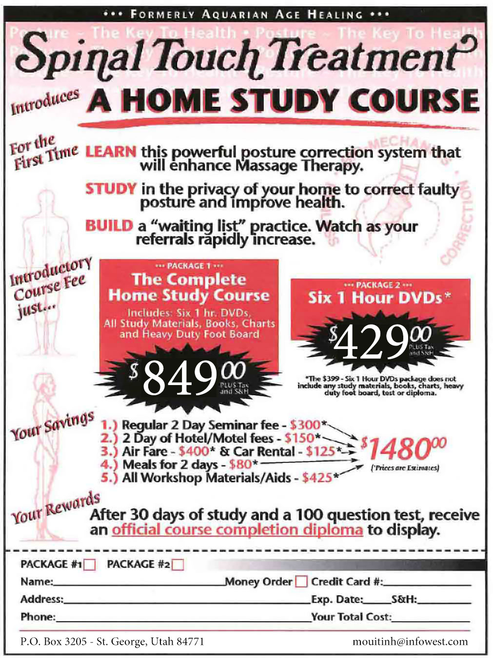 Spinal Touch Treatment ™ Home Study CourseSpinal Touch Treatment ™ Home Study CourseNow is your chance to learn this wonderful technique for yourself. Dr. Rosquist has prepared a study course with complete helps and materials to help you become a master in the Spinal Touch Treatment ™ or you can start with the DVD set. Spinal Touch Treatment ™ Home Study Course is the #1 home study course in the healing arts. It does not produce any pain or discomfort to the patient. The treatment works by applying a light, non-force treatment to promote results in the healing arts while correcting postural distortions. Get it now by going to the order page. Or Click Here for the printable order form. ![]() The Complete Home Study Course comes with all that you see below: ENCYCLOPEDIA OF SPINAL TOUCH | This book contains the complete history and theory behind the Spinal Touch Treatment ™. It also gives you step by step instructions with illustrating photos necessary to learn this powerful technique. ![]() WORKBOOK | This text contains easy to follow page by page illustrations and explanation of all the treatment points and their sequence. Excellent for quick reference. ![]() FOOT BOARD | This 14" x 16" molded plastic foot board is essential to performing a proper Spinal Touch Treatment ™. It aligns the feet so the proper treatment points can be determined. Portable, very light weight and can fit in your brief case. ![]() SIX ONE HOUR DVDs | These six one hour DVDs were taken of Dr. Rosquist presenting a Spinal Touch Seminar. They cover every aspect of this powerful technique from start to finish. ![]() Aging, Long Life & Better Health (20 FREE copies - Limited Time!) | This book covers the 6 steps necessary to achieving optimal health. The Spinal Touch Treatment ™ is the ultimate in complimentry medicine. Great for handing out to patients. Once they read this, they will want to receive The Spinal Touch treatment. ![]() Two Laminated Biomachanics Wall Charts | 17" x 30" wall charts are excellent for sparking client patient interest and is a wonderful educational tool. Hung on a wall next to you, they can be used for quick reference in performing a correct Spinal Touch Treatment ™. ![]() ![]() Spinal Touch Treatment ™ Brochures | Samples of pamphlets made to give to your clients/patients that explain what the Spinal Touch Treatment ™ is. (Posture: Key to Health, and Spinal Touch Brochure, 1 of each) A real time saver, these illustrated pamphlets will make your clients/patients more aware of the effects of posture on their health and the benefits they may receive from the Spinal touch Treatment. Additional pamphlets can be purchased separately on this site. ![]() ![]() ![]() |